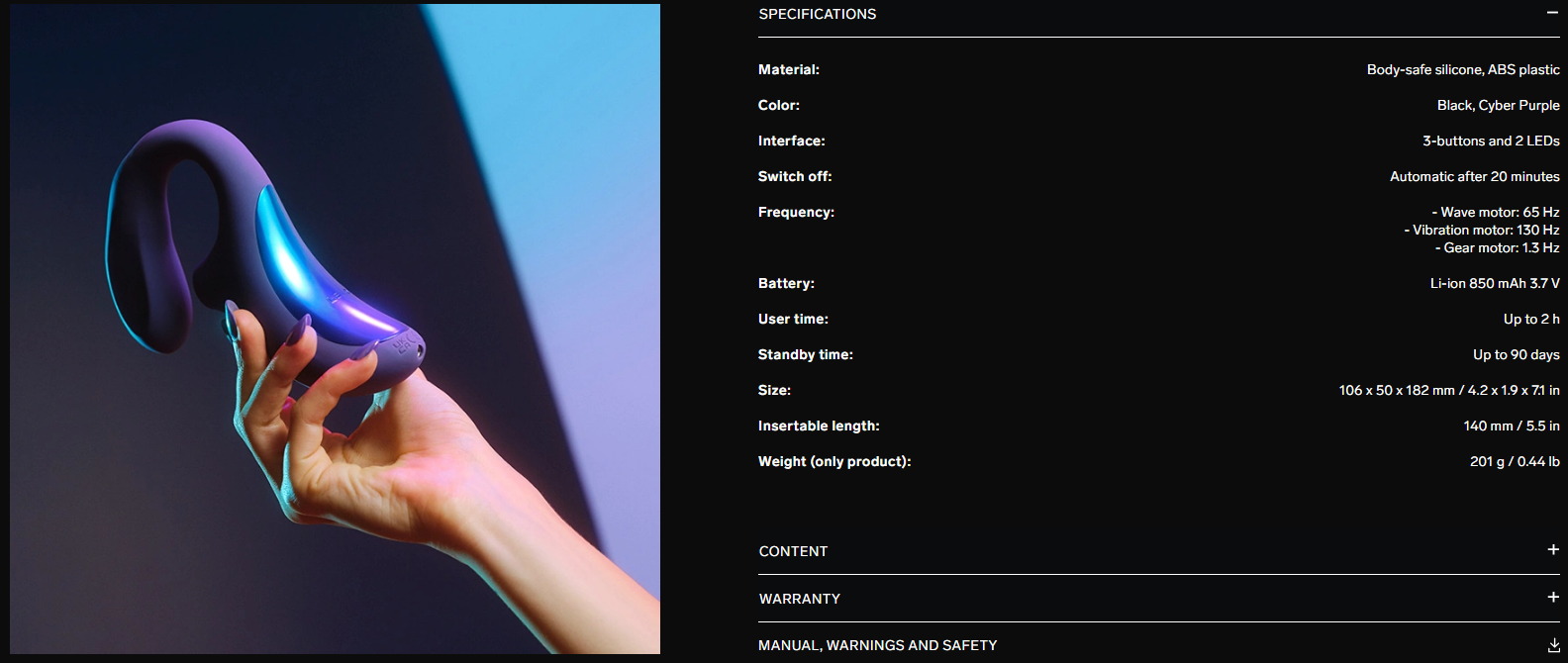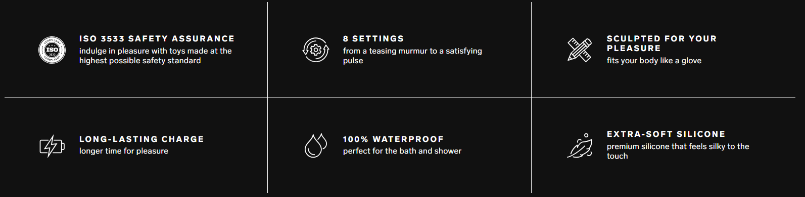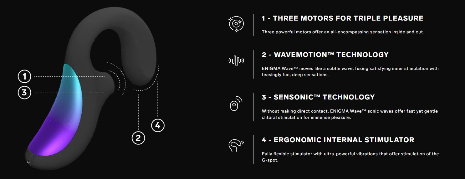 S ôsmimi nastaveniami potešenia, tromi výkonnými motormi a aktualizovaným dizajnom je ENIGMA Wave™ ideálnym zariadením na potešenie pre tých, ktorí hľadajú bezkonkurenčnú trojitú stimuláciu. Vyrobené z prémiového silikónu bezpečného pre telo, ponúka charakteristickú stimuláciu klitorisu pomocou technológie SenSonic™ a spektakulárnu masáž G-bodu pomocou technológie WaveMotion™. Prvý motor je zodpovedný za vnútornú vlnovú stimuláciu, druhý za senzácie vyvolávajúce vibrácie a tretí, využívajúci technológiu SenSonic™, poskytuje zvukové pulzy, ktoré rezonujú hlboko do vnútornej štruktúry klitorisu pre úplne nový pocit.