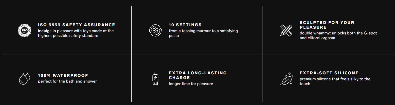 Navrhnuté na dosiahnutie dvojitého orgazmu G-bodu a klitorisu—konečný cieľ všetkých sexuálnych snáh. Po zažití tohto, akákoľvek rozkoš pod touto úrovňou sa zdá byť neúplná. Preto, vybavené technológiou Cruise Control™, zabezpečuje konzistentnú intenzitu aj pri silnom tlaku, poskytujúc mocné a hlboké uvoľnenie. Teraz môžete zažiť dvojité orgazmy znova a znova, čím pozdvihnete svoj sexuálny zážitok na úplne novú úroveň.