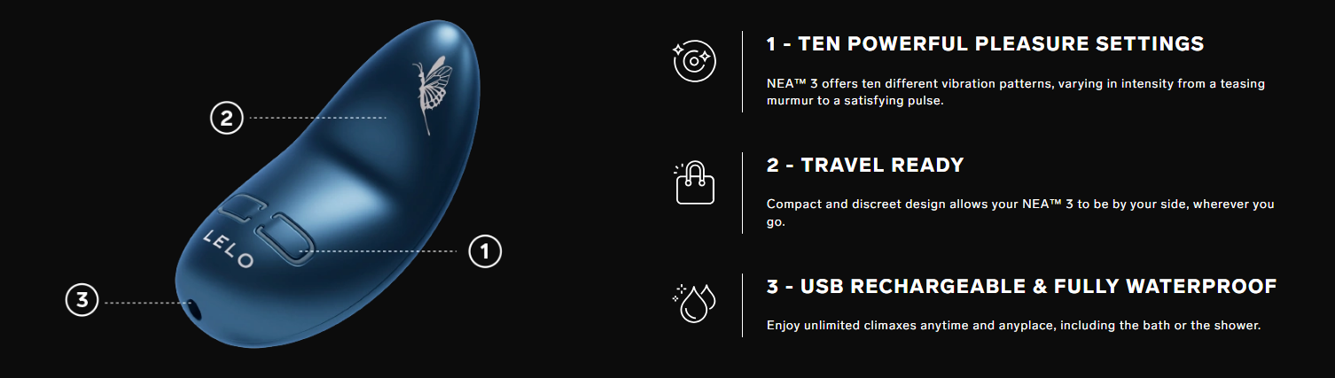 Nenechajte sa zmiasť malými a diskrétnymi vzhľadmi osobného maséra NEA™ 3, pretože obsahuje desať silných vibračných nastavení vo svojom pozoruhodnom tvare. Úplne vodotesný a ultra tichý, je to sexuálna hračka zameraná výhradne na zmysel pre dotyk, vedúca vás do novej éry osobného uspokojenia.