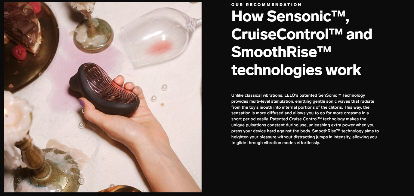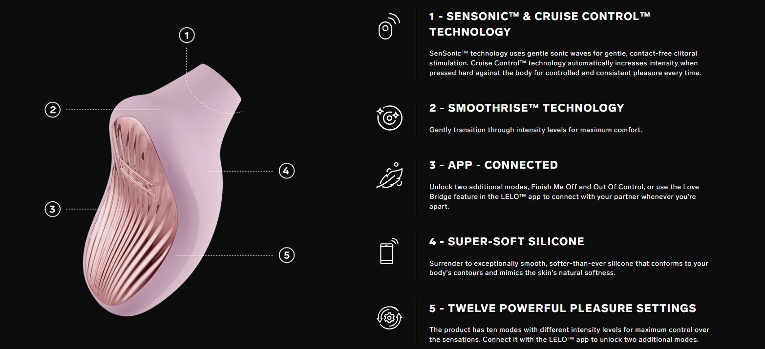 SONA™ 3 Cruise je sonický masážny prístroj na klitoris, ktorý využíva technológiu SenSonic™ na stimuláciu sonickými vlnami a novú technológiu SmoothRise™, ktorá vám umožňuje jemne prechádzať medzi úrovňami intenzity pre maximálne pohodlie. Obsahuje tiež technológiu Cruise Control™, ktorá zabezpečuje konzistentnú intenzitu počas používania, bez ohľadu na to, ako silno ho pritlačíte na svoje telo. Jeho super jemný silikónový povrch poskytuje hladkosť počas používania, čo ho robí ideálnym pre nepretržité a intenzívne potešenie. SONA™ 3 Cruise obsahuje desať vstavaných nastavení potešenia plus dva exkluzívne bonusové režimy a funkciu Love Bridge pre dlhodobé spojenie, všetko dostupné v aplikácii LELO™.